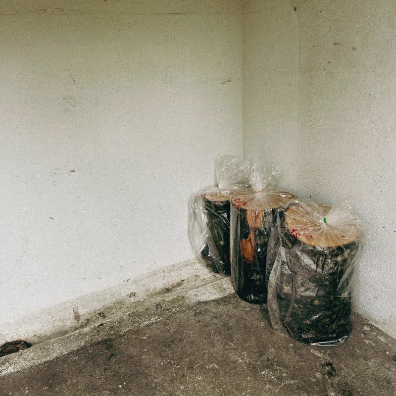 Les troncs d'arbres sont inoculés avec cinq variétés de champignons (notamment des pleurotes en huître, des shiitakes, des namakos). Pour ce faire, des trous sont percés et remplis de chevilles inoculées de mycélium. Ils sont ensuite arrosés, emballés dans du plastique et stockés à environ 20 °C. Au début de l'été, les troncs sont enterrés. Nous attendons les premières récoltes à partir de l'automne ou de l'hiver, et ce pendant plusieurs années.