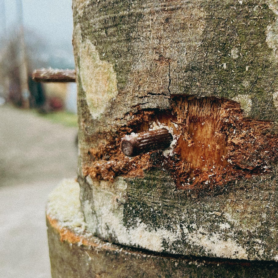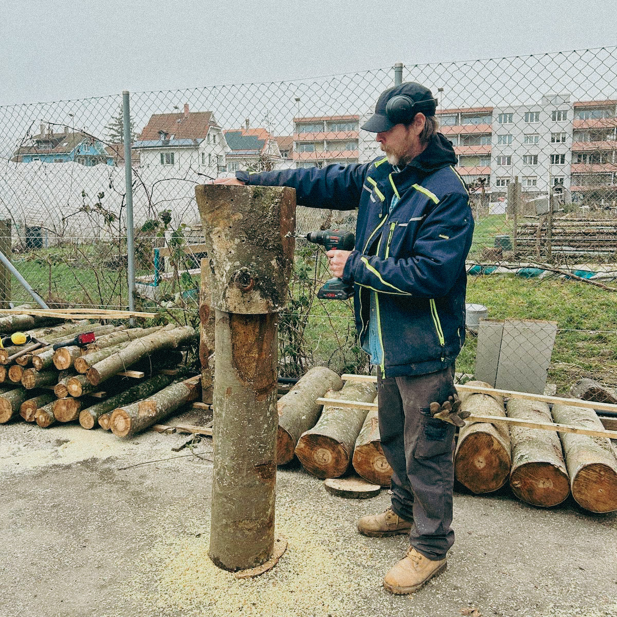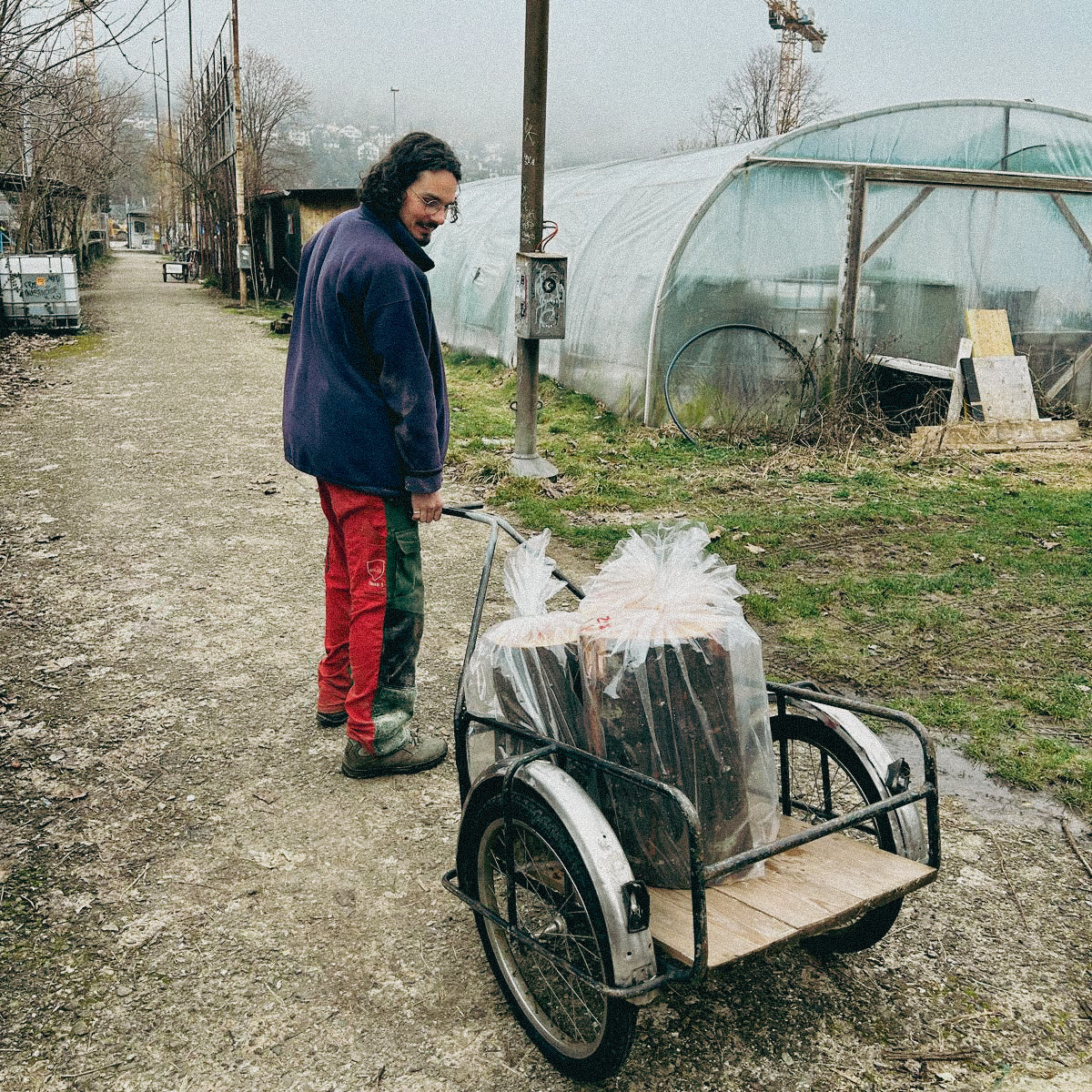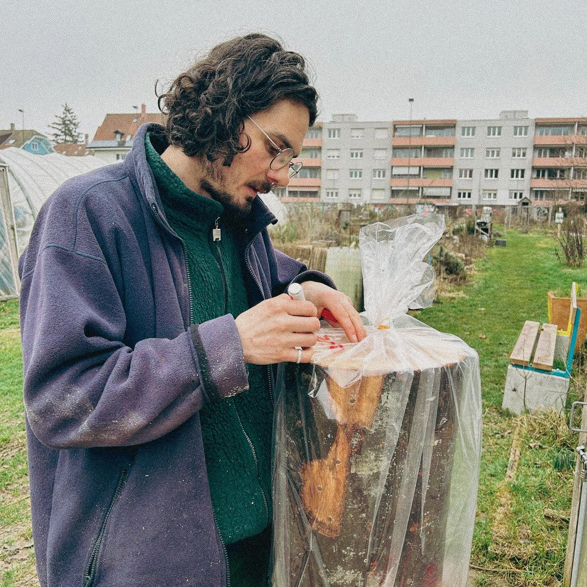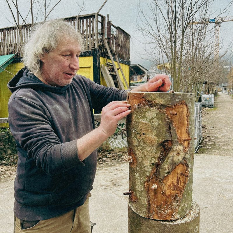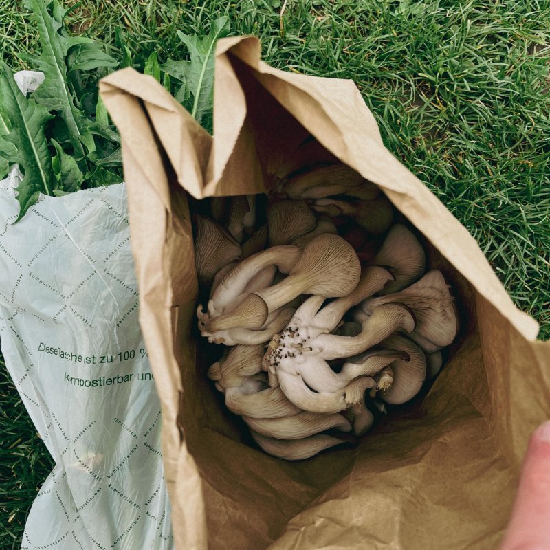 Holzstämme werden mit fünf Pilzsorten beimpft (u. a. Austern- und Lungenseitling, Shiitake, Nameko, Samtfussrübling). Dafür werden Löcher gebohrt und mit myzelbeimpften Dübeln (Dübelbrut) bestückt. Anschliessend wird gewässert, in Plastik verpackt und bei ca. 20 °C gelagert. Im Frühsommer werden die Stämme eingegraben. Erste Ernten erwarten wir ab Herbst bzw. Winter - und über mehrere Jahre.